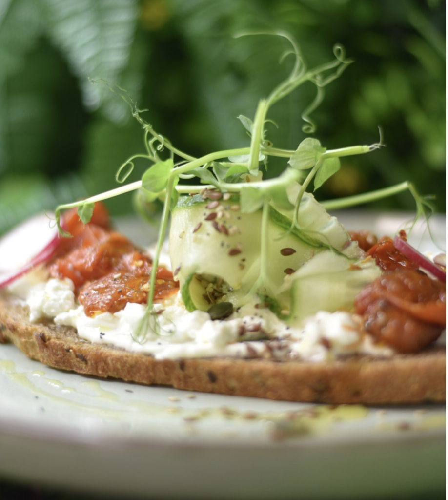 Fromage de coton sur pain au levain, tomates épicées, filet de miel et graines, fines tranches de concombre et de radis